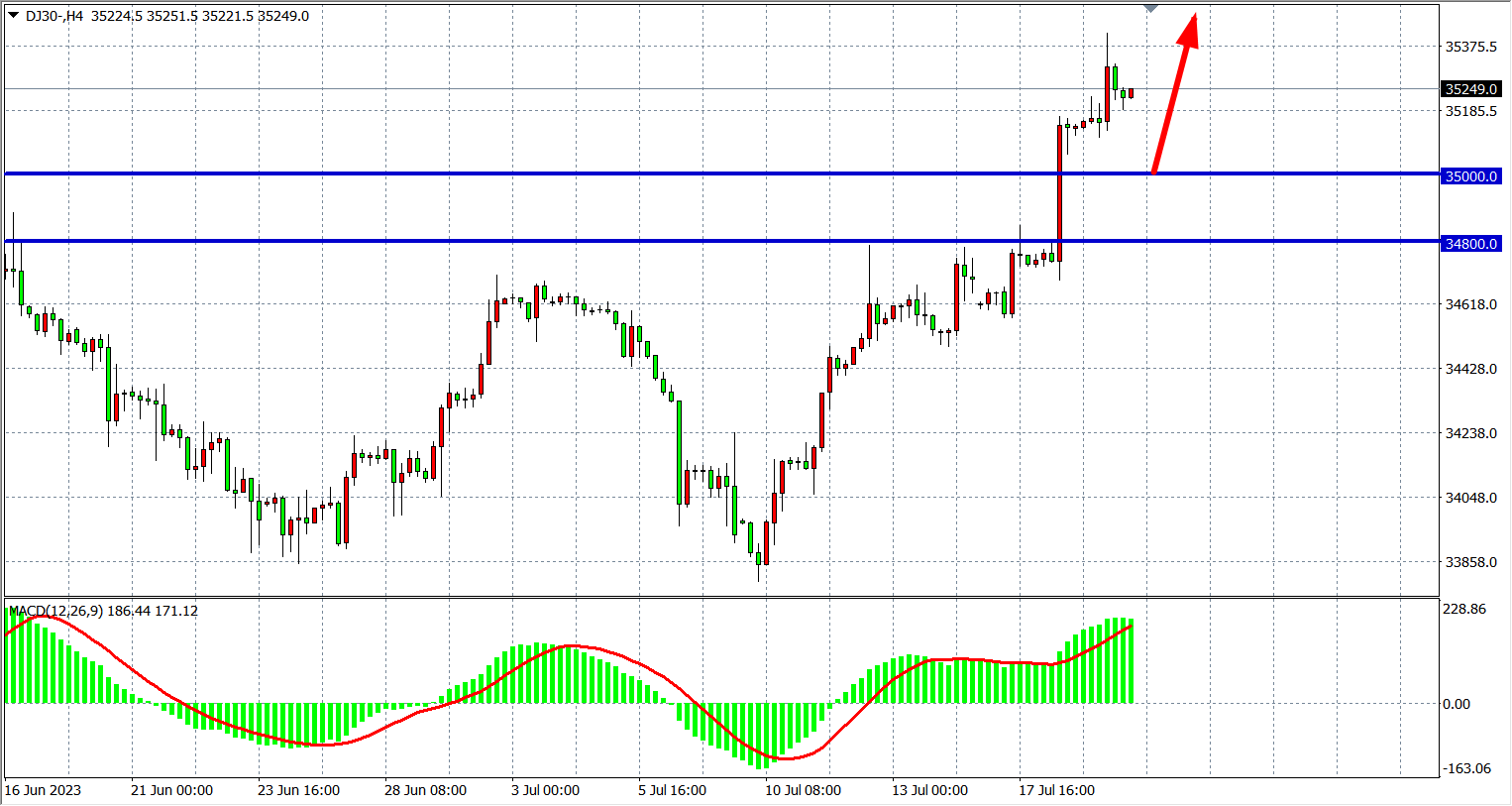 4小时图看,道指继续走高至3500之上,MACD量能维持零轴上放量,多头趋势强劲,支撑上移35000附近,阻力35500-35800。