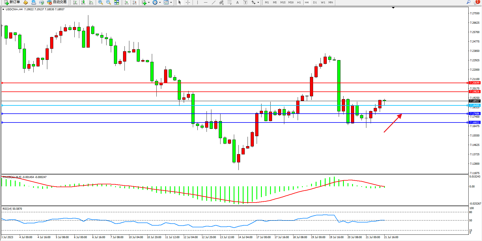 交易策略:7.18495上方看涨,目标7.19826  7.20699