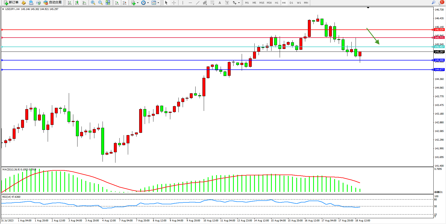 交易策略:145.457下方看跌,目标145.000  144.677
