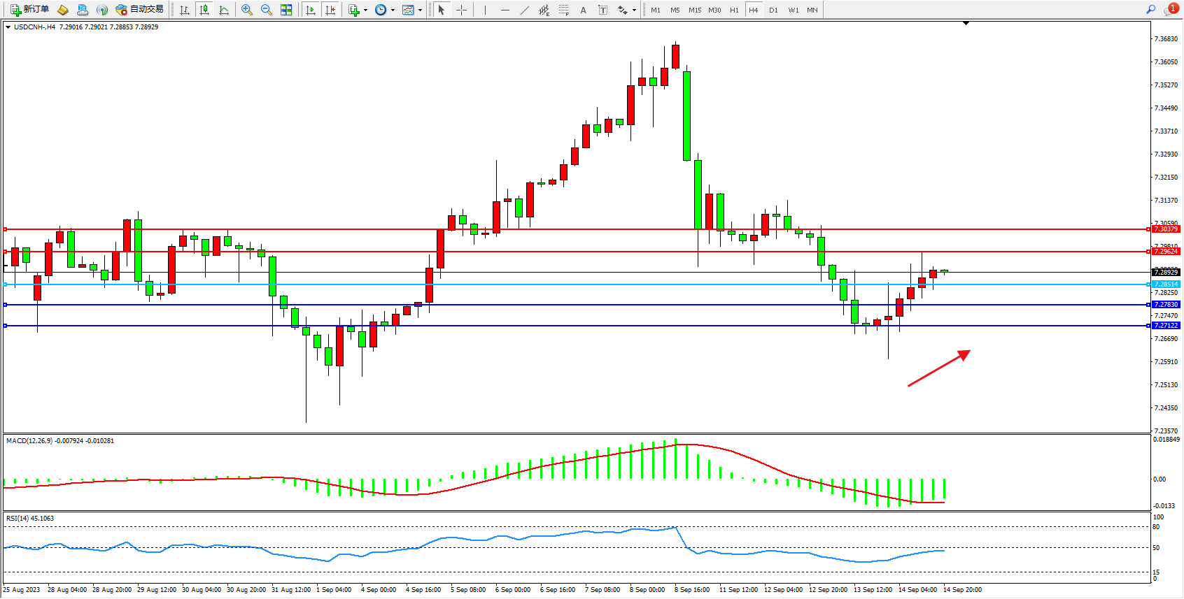 美元人民币USDCNH——4小时K线图显示: