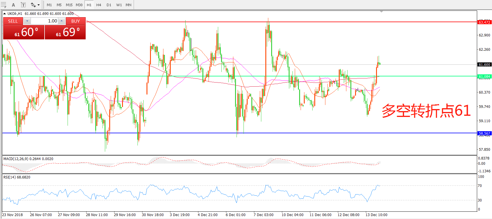 小时图看,油价触及50美元附近后强势反弹,整体价格再次回到61美元之上,均线系统逐渐粘合,,MACD红柱增加,日内仍以整理走势为主。