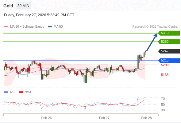 在 5215 之上,看涨,目标价位为 5280 ,然后为 5310 。