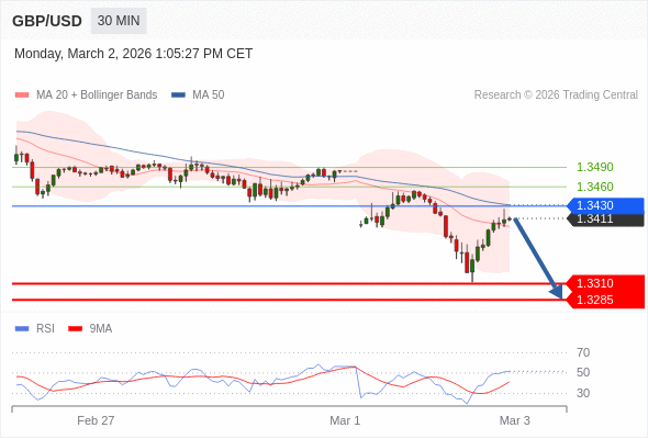 在 1.3430 之下,看跌,目标价位为 1.3310 ,然后为 1.3285 。
