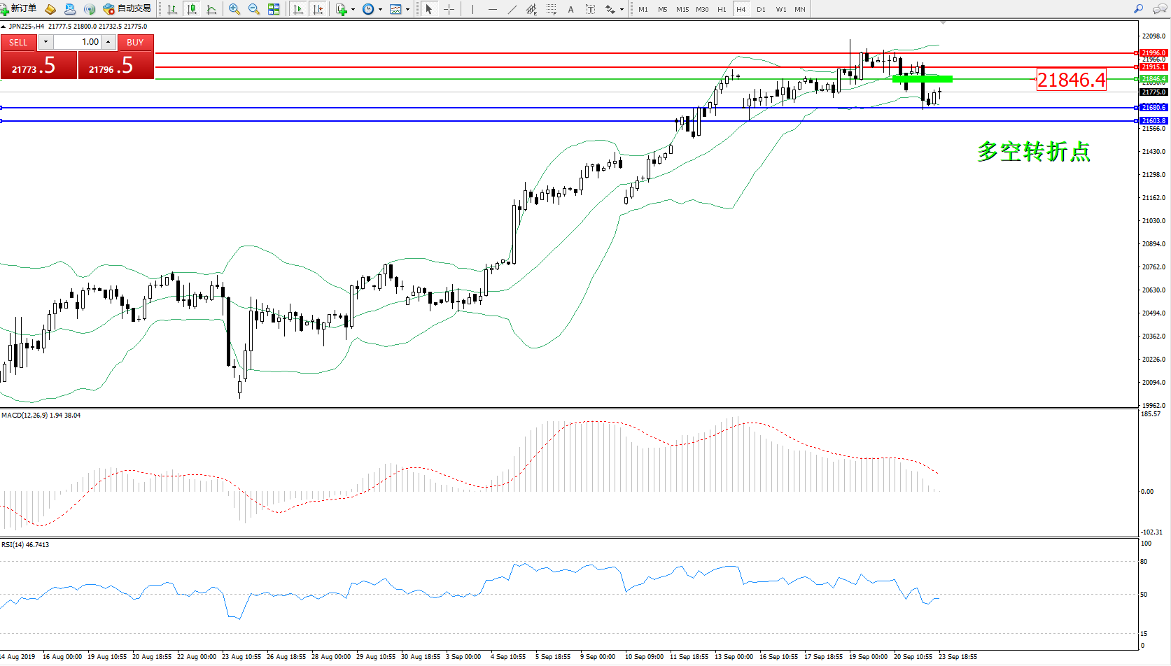 技术点评:多头维持高位持续震荡数日之久,处于布林带指标中下轨区间横盘整理中,市场正寻找新的方向指引,但多头上行有明显减弱而空头有伺机入场迹象,MACD指标多头区域高位缓慢下行至0轴线附近徘徊,有破位下行态势,RSI指标处于50均衡线维持来回震荡整理中;