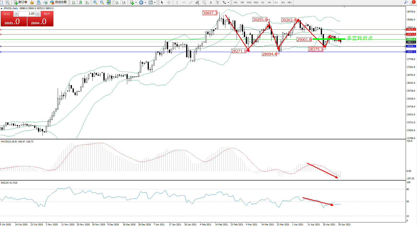 技术点评:长时间维持在布林带指标通道内处于宽幅震荡走势中,空头动力司机入场跌破布林带指标下轨附近节点后不断向下移动中,低位抵达28375附近得到短暂支撑多头伺机入场,反转回升后整理平移,但空头下行动力依据存在,布林带指标呈张口走势后开始收口,但仍处于下轨附近弱势震荡中,MACD指标处于0轴线下方维持震荡平移,RSI指标空头动力弱势纠结于50均衡线下方空头区域弱势整理;