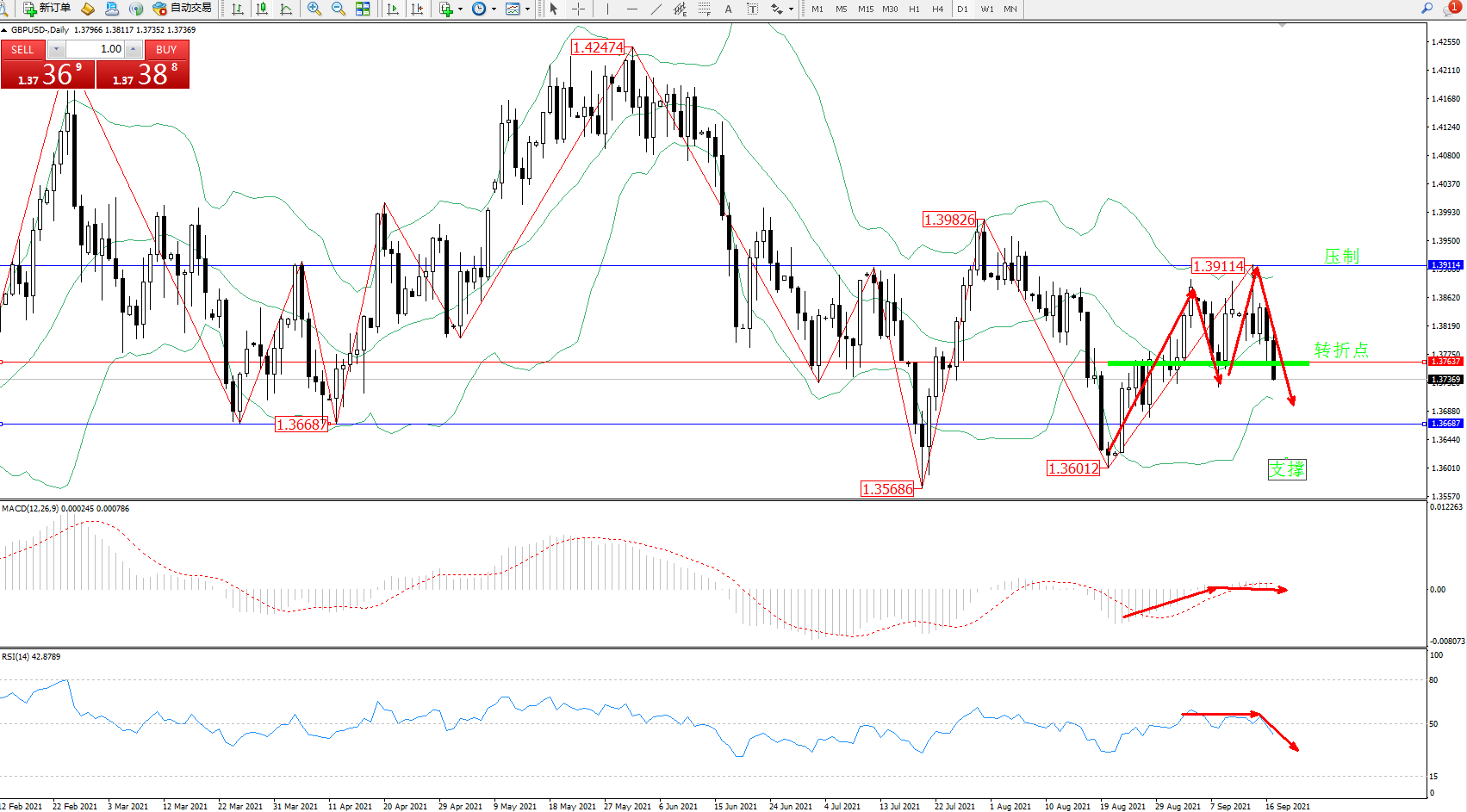 低位多头动力维持震荡上移至布林带指标通道中上轨区间持续宽幅震荡后,高位抵达布林带指标上轨1.39114位置遇阻急速震荡回撤,跌破中轨后进入中下轨区间下行,即将触及下轨附近节点,布林带指标呈收口走势后有缓慢张口迹象,上方压制关注1.39114位置附近,低位支撑关注1.36687附近,关注1.37637附近转折点,MACD指标处于0轴线附近弱势徘徊,RSI指标处于50均衡线附近弱势整理后开始下行至空头区域徘徊,如图: