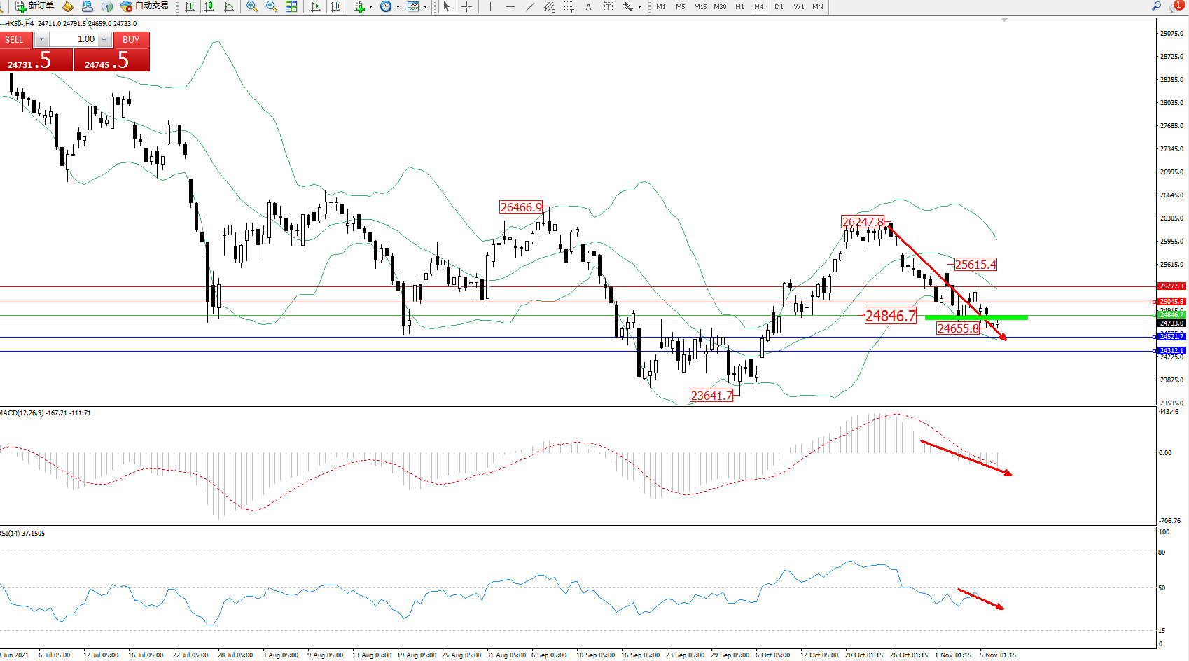 恒指HK50 ——4小时K线图显示: