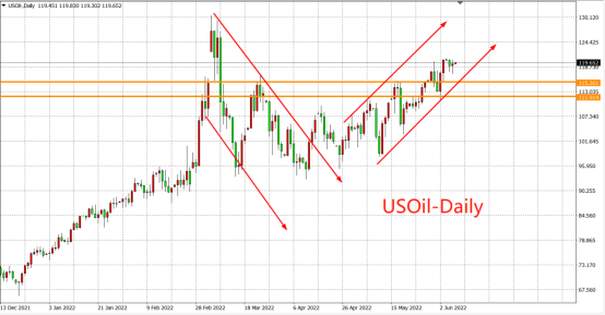 日线图显示,WTI原油目前正处于上升趋势中,下方强支撑在112-115区域,上方若进一步突破120-122区域阻力,后市则有望进一步挑战前高130美元水平。若WTI原油最终辗转失守112美元,则需警惕油价大级别转入跌势的可能,届时或再度回落考验105美元甚至更低位100美元水平。