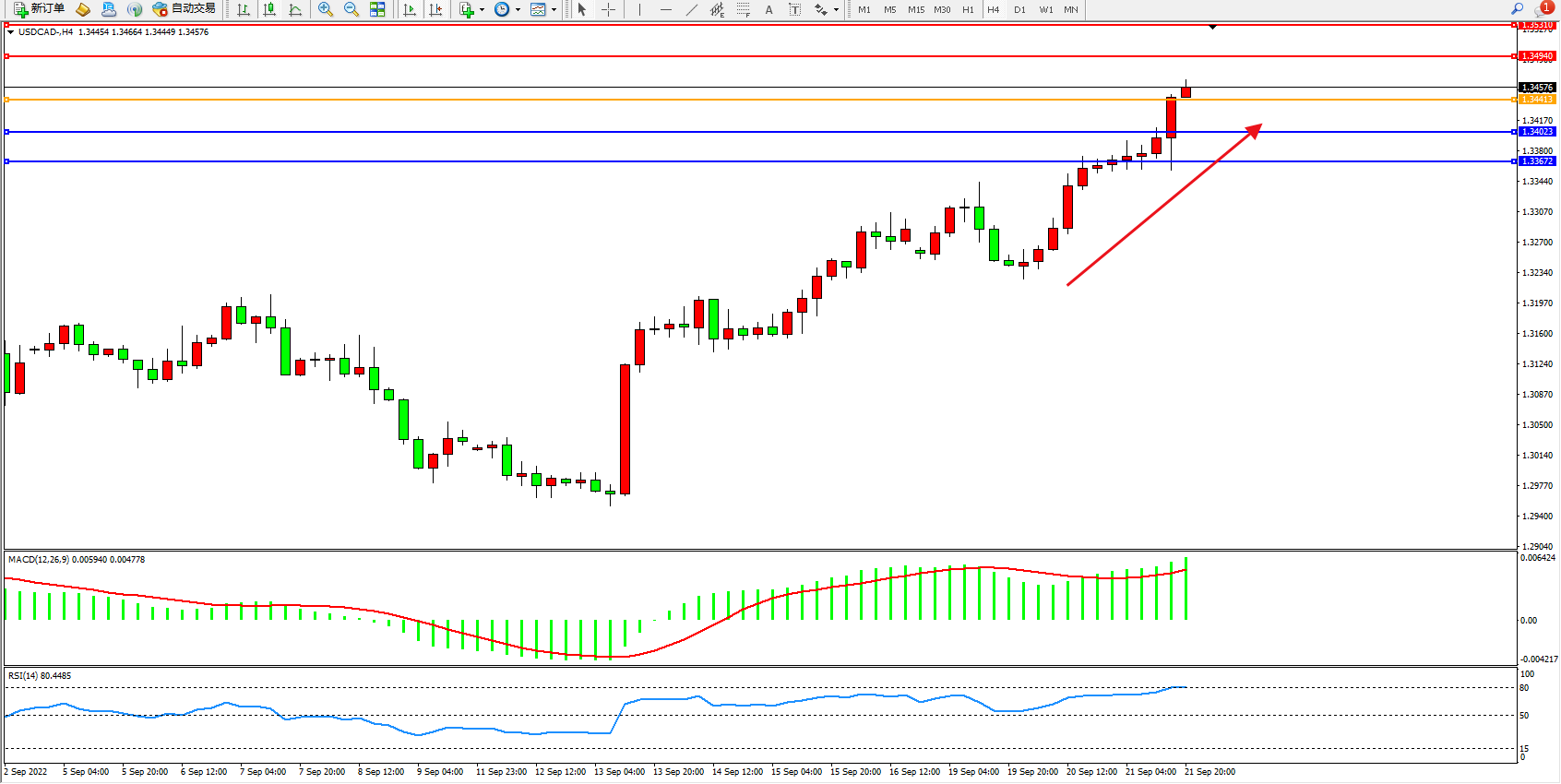 美元加元USDCAD——4小时K线图显示: