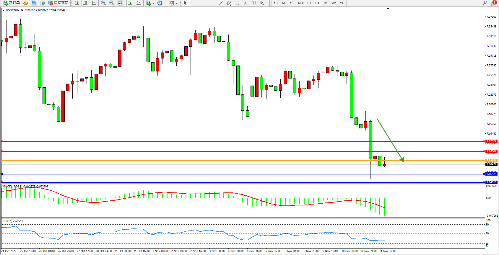 美元人民币USDCNH——4小时K线图显示: