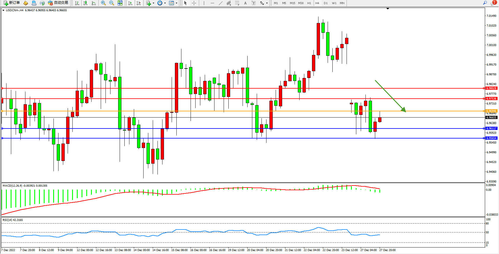 交易策略:6.96946下方看跌,目标6.96117、6.95654