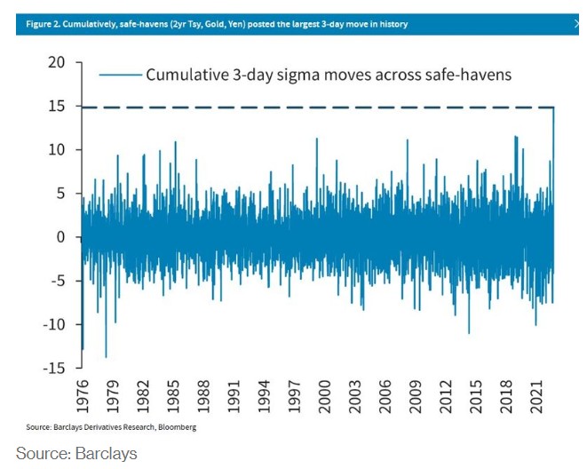 截至周一的三个交易日,美国两年期国债收益率下跌109个基点,创下1987年以来最大跌幅。与此同时,金价上涨,日元兑美元走强。巴克莱的数据显示,这三天的波动幅度是至少1976年以来最大的。
