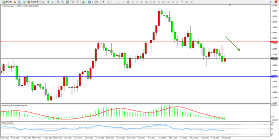 空头动力持续震荡向下移动,短期跌势或将延续,市场整体空头情绪笼罩,上方压制关注1.28472附近,低位支撑关注1.25308附近,MACD指标处于0轴线下侧弱势整理,RSI指标处于50均衡线下侧弱势徘徊;如图: