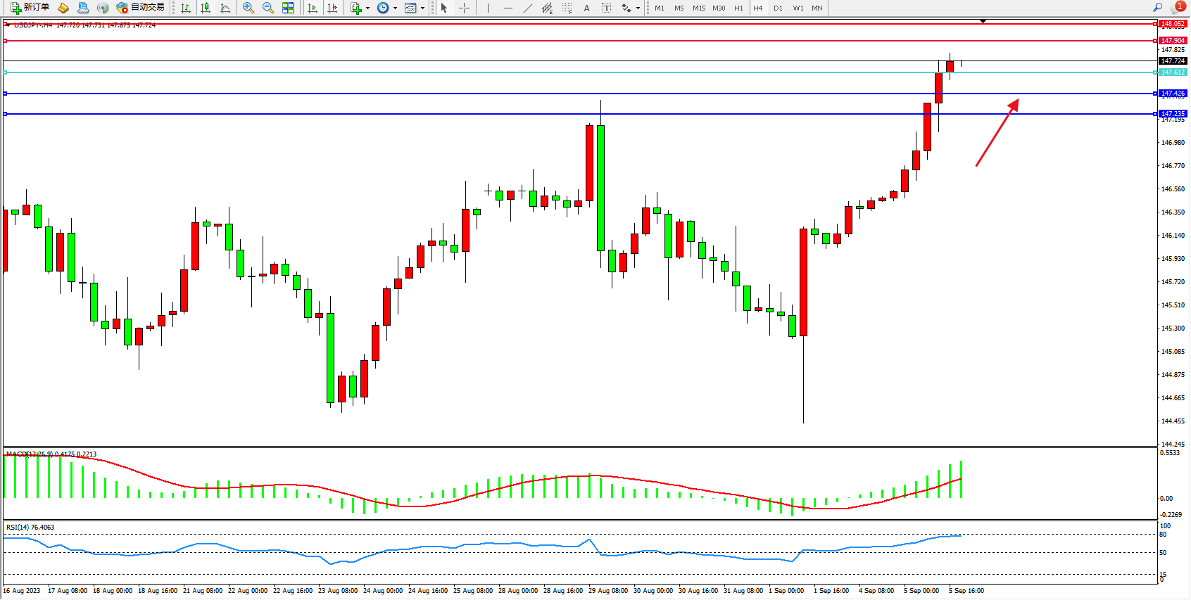 备选策略:147.612下方看跌,目标147.426 147.235